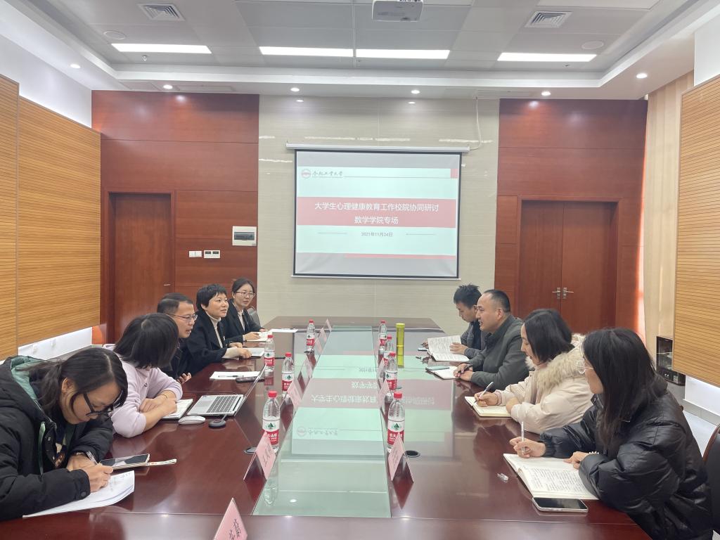 11月24日下午,数学学院2021年心理育人工作校院协同研讨会在翡翠湖校区科教楼A座第三会议室举行。党委学生工作部心理健康教育与咨询中心、学院相关领导和老师参加了会议。学院党委书记范仁庆代表学院向心理健康教育与咨询中心各位领导老师表示欢迎,数学学...