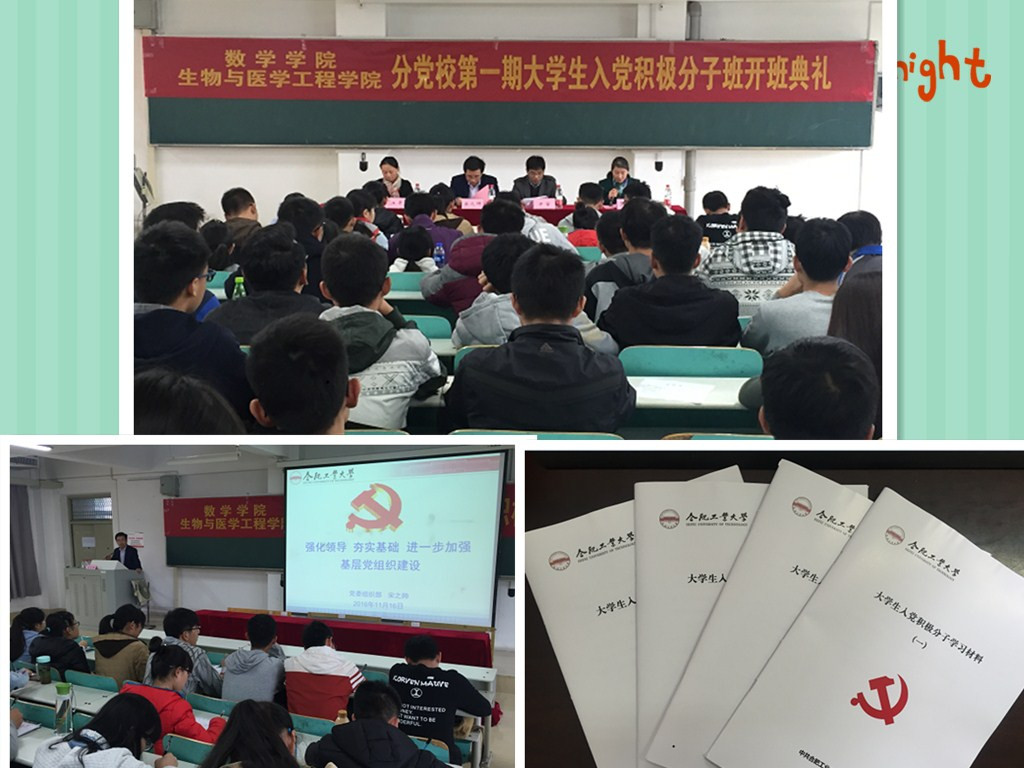 11月16日下午,数学学院和生物与医学工程学院分党校第一期大学生入党积极分子班开班典礼在翡翠湖校区7教202举行。校党委组织部和相关学院的负责人出席开班典礼。 开学典礼上,相关学院负责人布置了本期党校入党积极分...