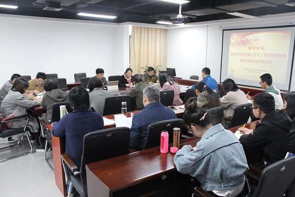 为认真学习宣传党的十九大精神,进一步提高认识、凝聚共识、统一行动,11月14日下午,数学学院在翡翠湖校区科教东楼1710举办了理论学习中心组(扩大)学习会暨党支部书记培训班开班仪式,学习会由数学学院党委副书记...