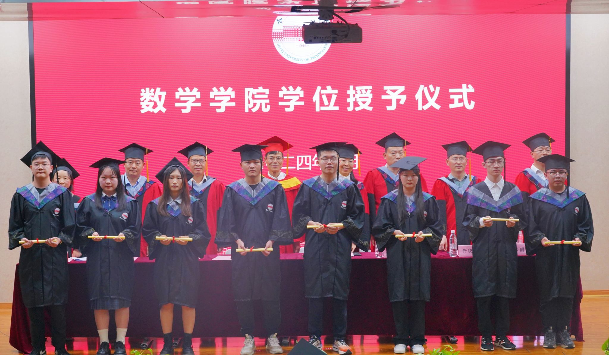 学院党委书记范仁庆宣读了《关于表彰二〇二四年安徽省普通高等学校优秀毕业生和合肥工业大学优秀毕业生的决定》。院长张莉宣读了《数学学院2024届毕业生学位授予决定》。在庄严的音乐声中,毕业生们身着学位服依次接受学位证书、扶苏正冠,并合影留念。