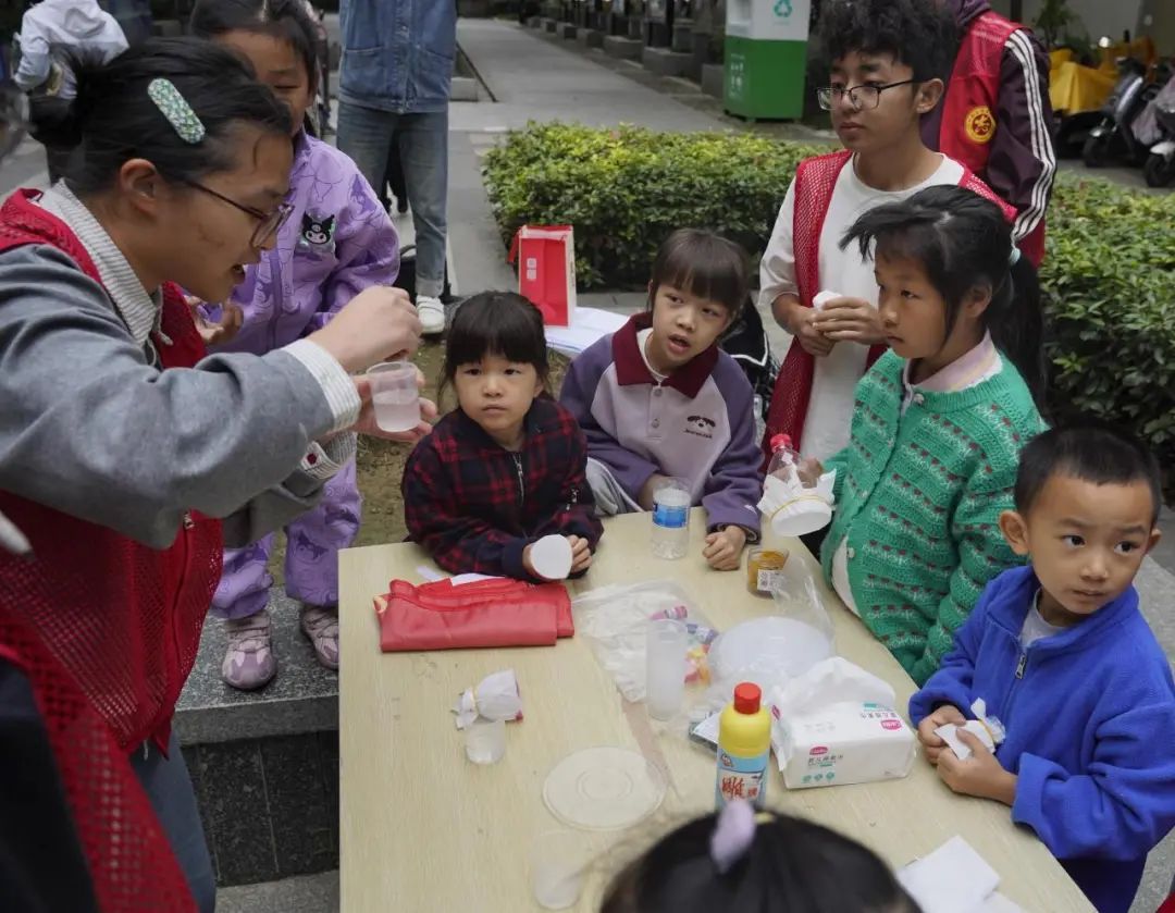 在活动中,志愿者们耐心指导孩子们进行“彩虹泡泡龙”和“泡泡颜色实验”的操作。他们一步步示范如何巧妙地将洗洁精、色素、卸妆棉和皮筋等材料组合在一起,孩子们在志愿者的帮助下亲手制作出五彩斑斓的泡泡龙。看到泡泡喷涌而出的奇妙景象,孩子们脸上洋溢着兴奋的笑容。