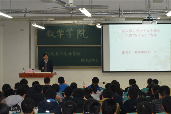 12月7日晚,数学学院于翡翠湖校区五教103开展了十九大精神宣讲报告暨“数苑有约——名师导航”院长报告会暨“燃点创新之花,砥砺思辩精神”主题博睿沙龙,数学学院院长朱士信分别作了题为《深入学习领会十九大精神,争做四有五好青年》《大学生数学学习和成长》的报告,学院2017级全体同学聆听了报告会。