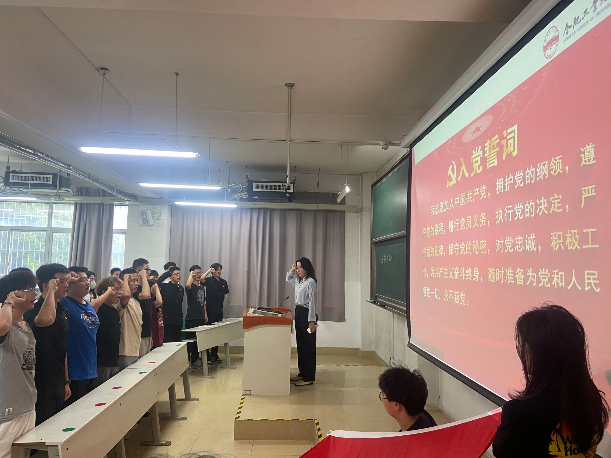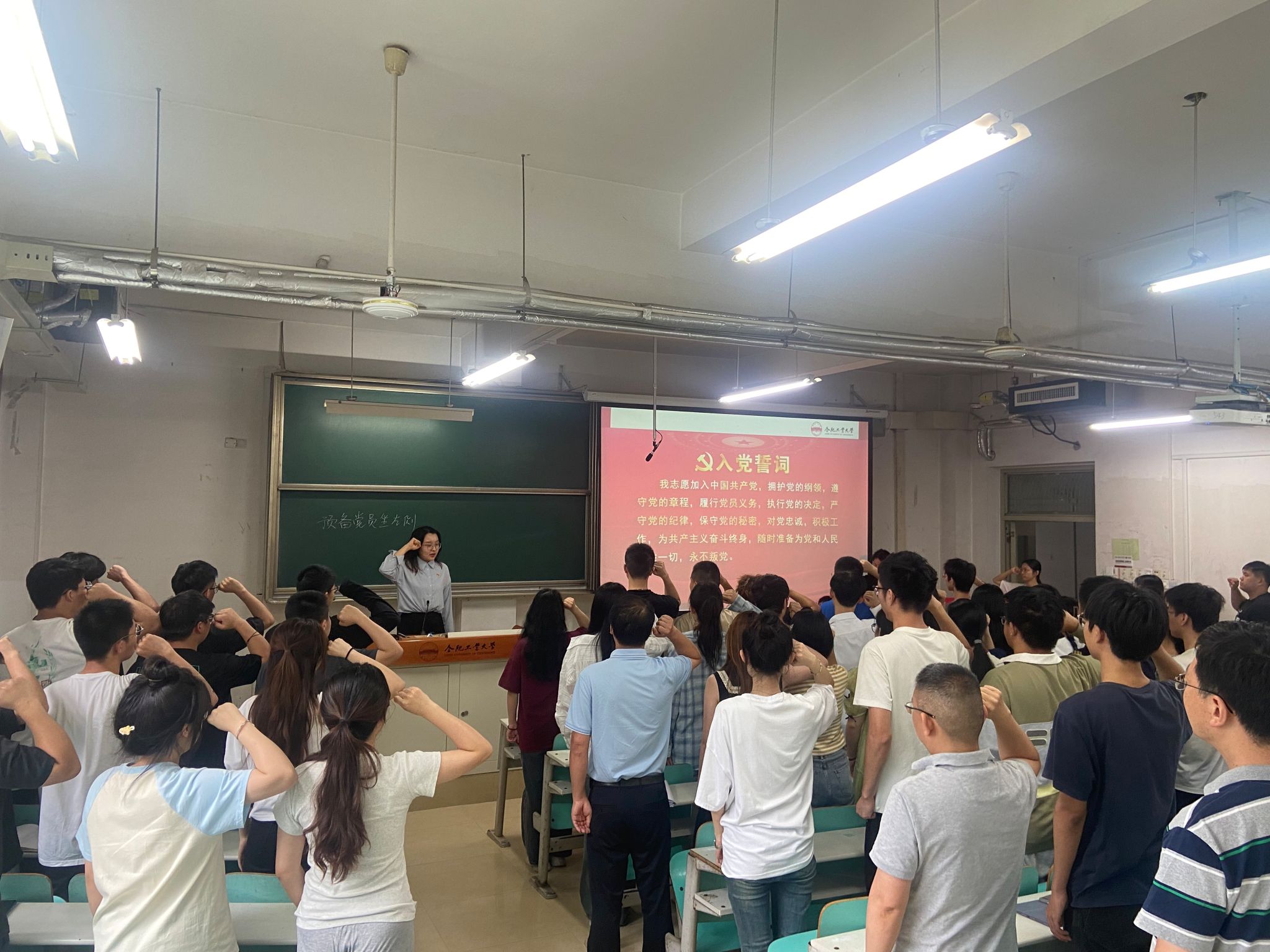 活动现场,在本科生第二党支部书记许芊蔚带领下,学院新发展党员,胸戴党徽,面向党旗,高举右拳,庄严宣誓,“我志愿加入中国共产党……”铮铮誓言、字字铿锵,许下对党和人民的庄严承诺。学院老党员重温入党誓词,回忆了入党宣誓时的承诺与初心,重温了入党时的梦想与追求。现场宣誓声如同号角声,催人奋进,激励着全体师生党员不忘初心、牢记使命、砥砺前行。