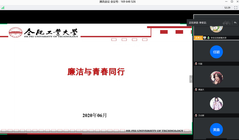 为进一步加强落实学生廉洁教育,促进毕业生提高认识、转变作风、遵章守纪、廉洁从业,6月11日-14日,数学学院通过腾讯会议平台在2020届本科毕业生中开展了“廉洁与青春同行”主题教育活动。
