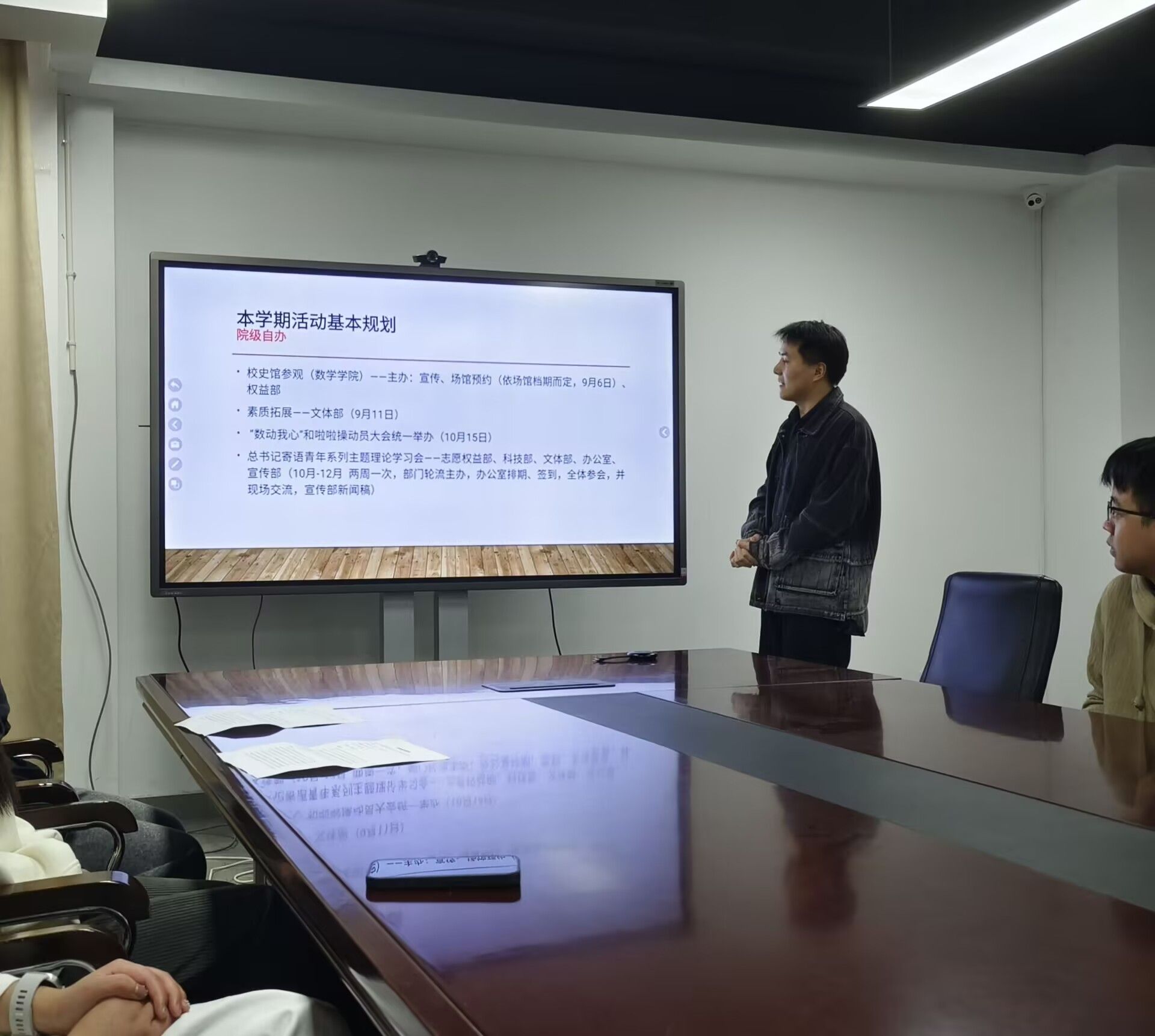 其次,主席团成员马龙开展了研究生啦啦操比赛的布置工作。首先,他总体介绍了啦啦操比赛是校级研究生最大的文艺活动,然后具体介绍了参与人员、奖励机制、时间安排和要求,并展示了数学学院往届优秀啦啦操作品的照片。
